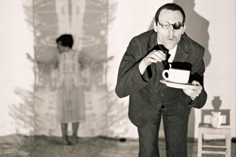MIRRORMINDED CURIOUSITEASEa performance inspired by the restless corpse of James Joyce's "Finnegans Wake" and the deviant eye of his daughter Lucia. Dance: Ephia and Benjamin Kraus (and Adam Palermo). Live Sound: Jeff Gburek. Video Projections: Diegonante. Presented November 5, 2008 in Potsdam at UNIDRAM 15.